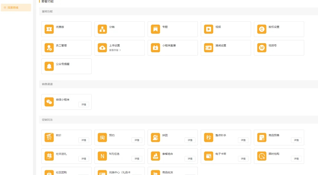 但功能比较齐全,涵盖商品管理、优惠券发放、拼团活动、数据统计等电商常用功能,无需额外开发。