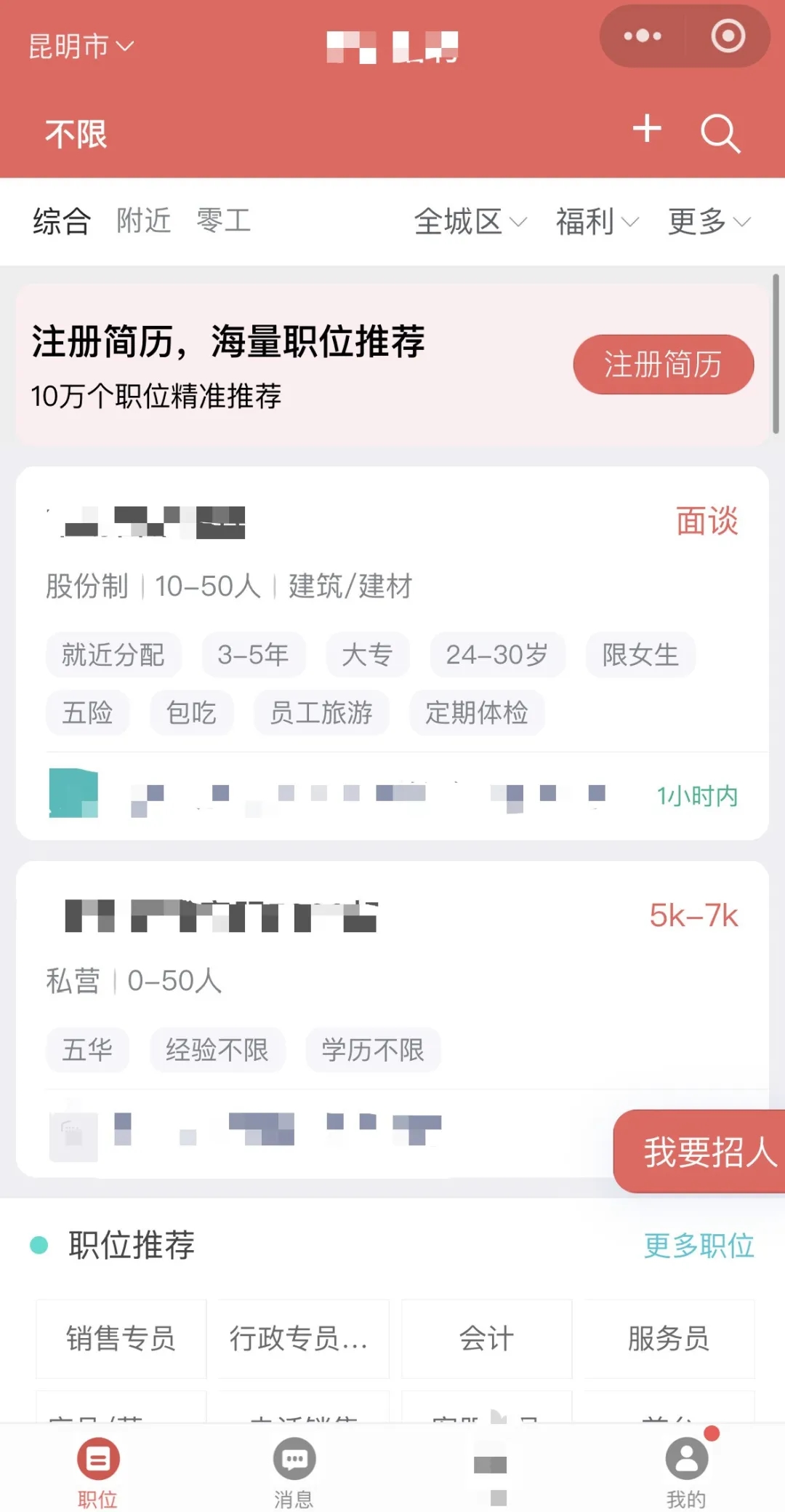 招聘类小程序开发建议不做即时聊天系统,会使开发成本翻倍,建议以年费或岗位发布频次为核心收费,求职者能否直接联系企业不重要,企业只需换人事的电话即可。